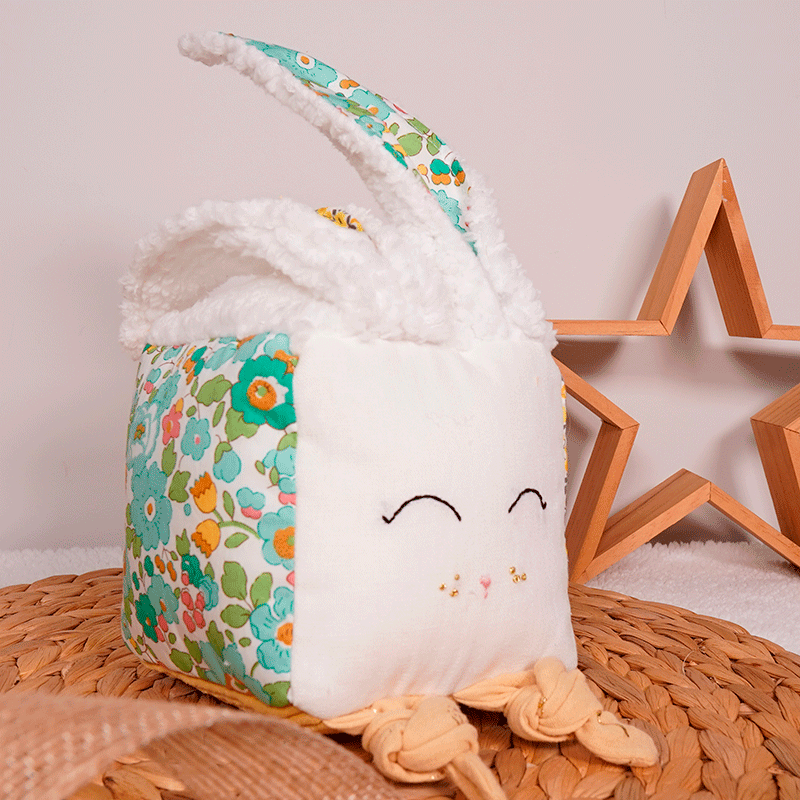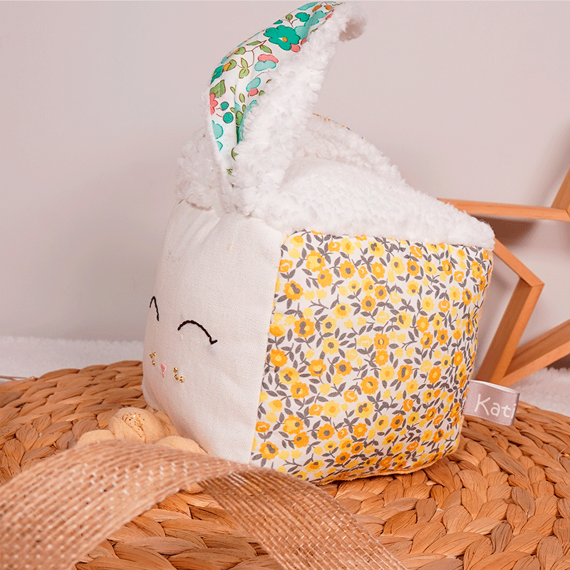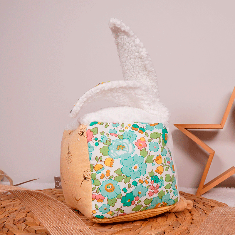 Entretien : Lavage recommandé à 30° Séchage à plat, pas de sèche-linge Pas de repassage Les + : - Oreilles de Lapin Ludiques : Les oreilles de lapin ajoutent une touche ludique au cube, invitant bébé à explorer et à s'amuser. L’une des oreilles contient du papier bruissant offrant ainsi une expérience tactile et auditive surprenante. - Développement Sensoriel : Les différentes textures et couleurs encouragent l'exploration tactile et visuelle, stimulant le développement sensoriel de votre bébé. - Apprentissage Ludique : Votre tout-petit développera sa motricité fine et sa coordination en manipulant et en explorant les différentes surfaces du cube.