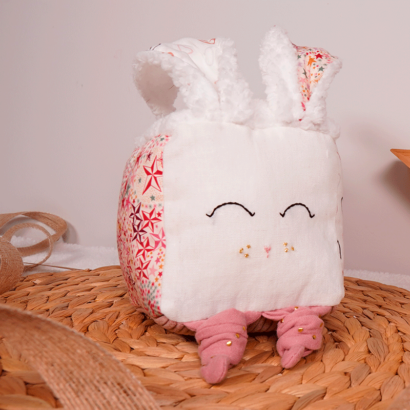Entretien : Lavage recommandé à 30° Séchage à plat, pas de sèche-linge Pas de repassage Les + : - Oreilles de Lapin Ludiques : Les oreilles de lapin ajoutent une touche ludique au cube, invitant bébé à explorer et à s'amuser. L’une des oreilles contient du papier bruissant offrant ainsi une expérience tactile et auditive surprenante. - Développement Sensoriel : Les différentes textures et couleurs encouragent l'exploration tactile et visuelle, stimulant le développement sensoriel de votre bébé. - Apprentissage Ludique : Votre tout-petit développera sa motricité fine et sa coordination en manipulant et en explorant les différentes surfaces du cube.